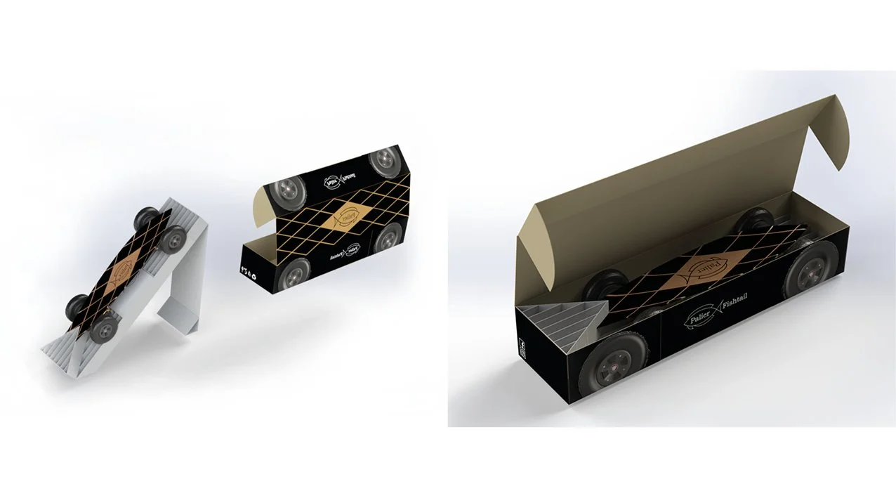 The packaging was designed to match the skateboard and act as a display, reducing waste while improving presentation. Inspired by the sunfish, the branding creates a strong visual identity, with built-in storage to keep components organised.