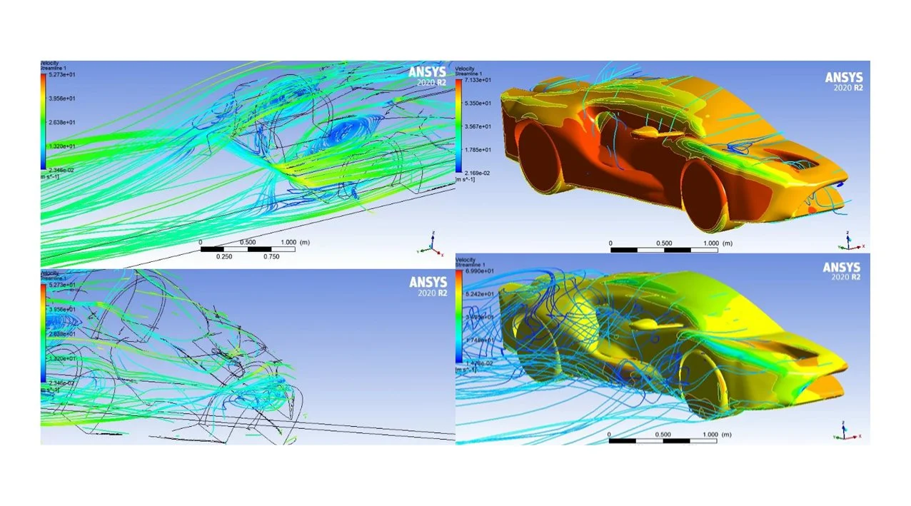 The ANSYS simulation showed smooth airflow overall, but turbulence was found at the rear vent and around the wheel arches. Airflow was also slower beneath the car rather than above, creating pressure differences that gave the car excellent downforce.