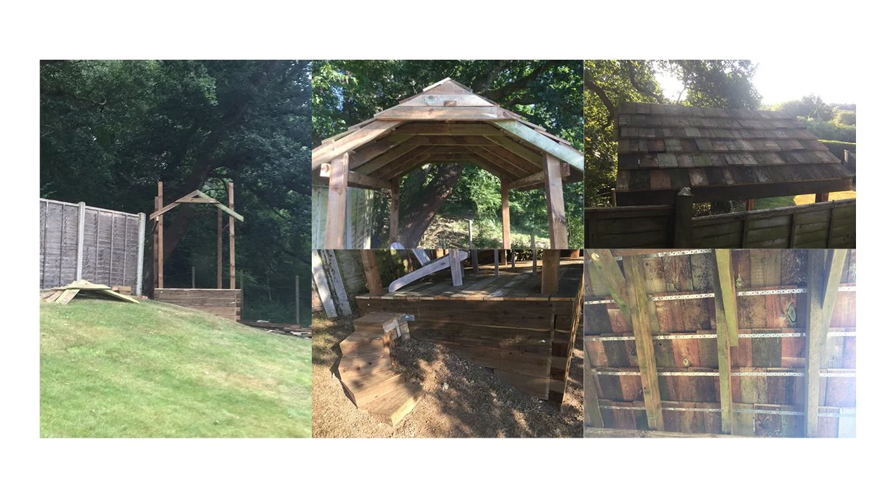Railway sleepers were used to level the ground, and all other materials were recycled from the existing treehouse. The supporting structure became the gazebo frame, floorboards were reused, and splintered wood was cut into roof shingles. A secondhand bench was added as a chain swing. The project was low-cost and successfully turned an unused garden area into a functional and inviting space.